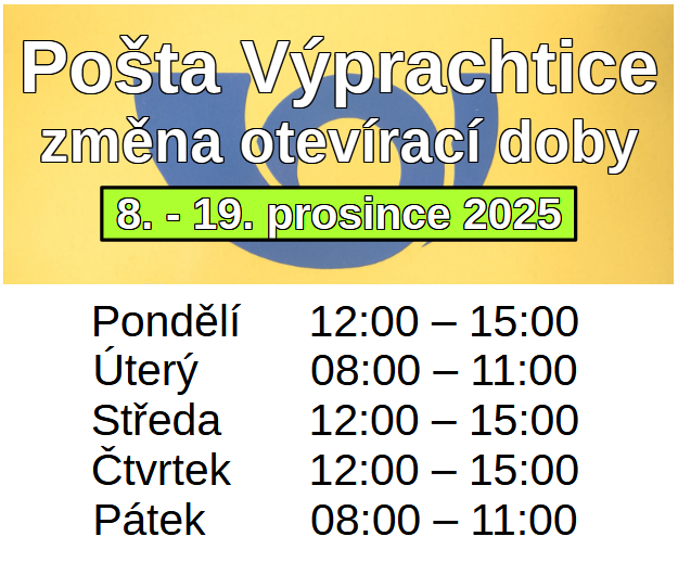 Česká pošta ve Výprachticích bude mít 2 týdny do 28. 11. 2025 změnu pracovní doby. V pondělí 17. 11. 2025 je zavřeno.
