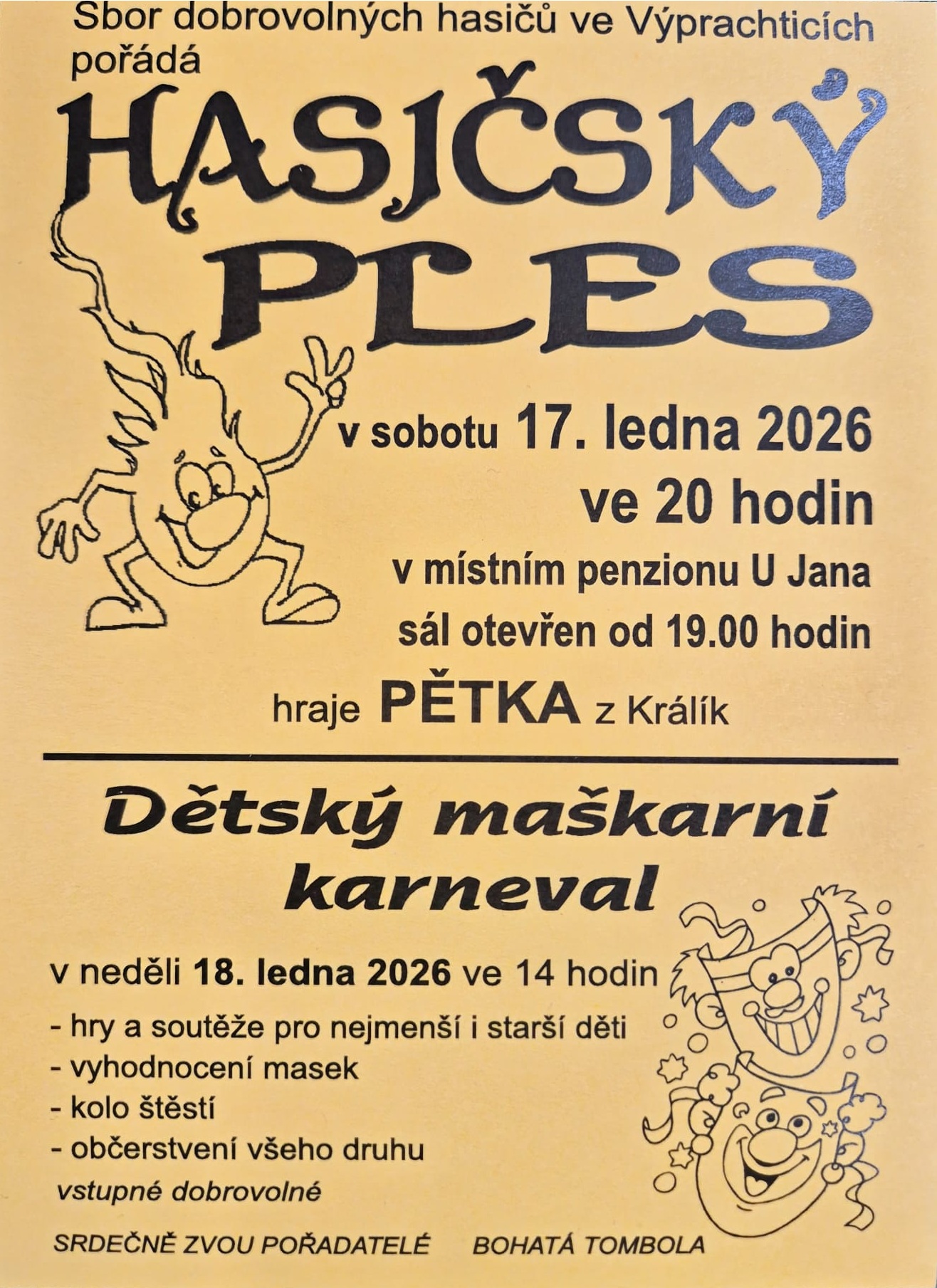 SDH Výprachtice pořádá v neděli 18.1.2026 od 14:00 hodin dětský maškarní karneval na sále penzionu U Jana. Soutěže pro děti, kolo štěstí, občerstvení zajištěno.