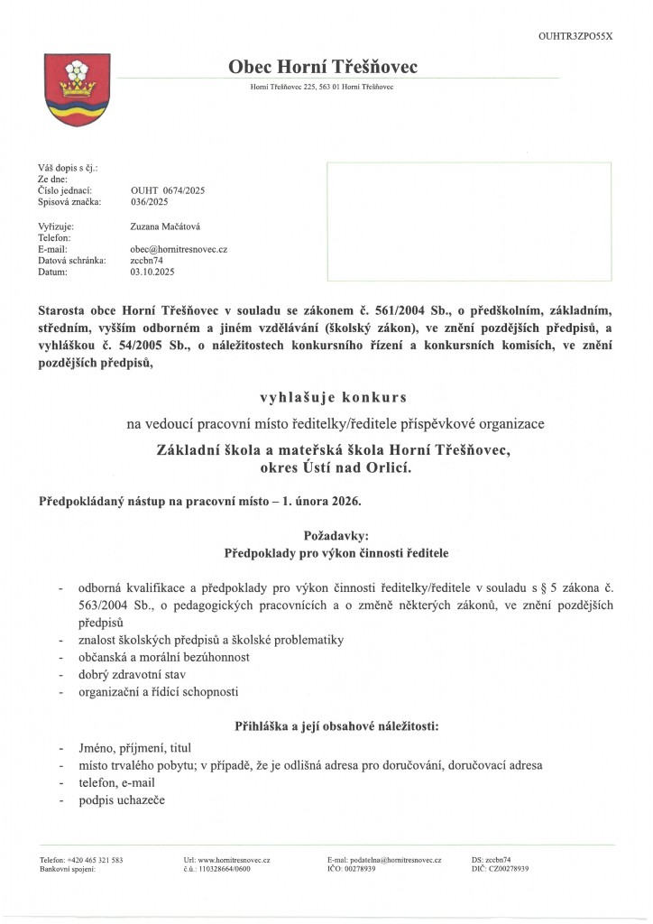 VYHLÁŠENÍ KONKURZU NA MÍSTO ŘEDITELE ZŠ A MŠ V OBCI HORNÍ TŘEŠŇOVEC